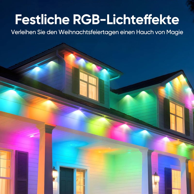 - 16 Mio. Farben + dynamische Effekte: Wechseln Sie im Handumdrehen zwischen 16 Millionen RGB+IC-Farben! Vorgefertigte Weihnachts-Themes machen Ihre Außenbeleuchtung zur festlichen Meisterleistung. Stellen Sie Warmweiß/Kaltweiß ein (280 Lumen, übertrifft 99 % ähnlicher Produkte) – gemütlicher Abend oder energiegeladene Party, alles mit einem Licht!